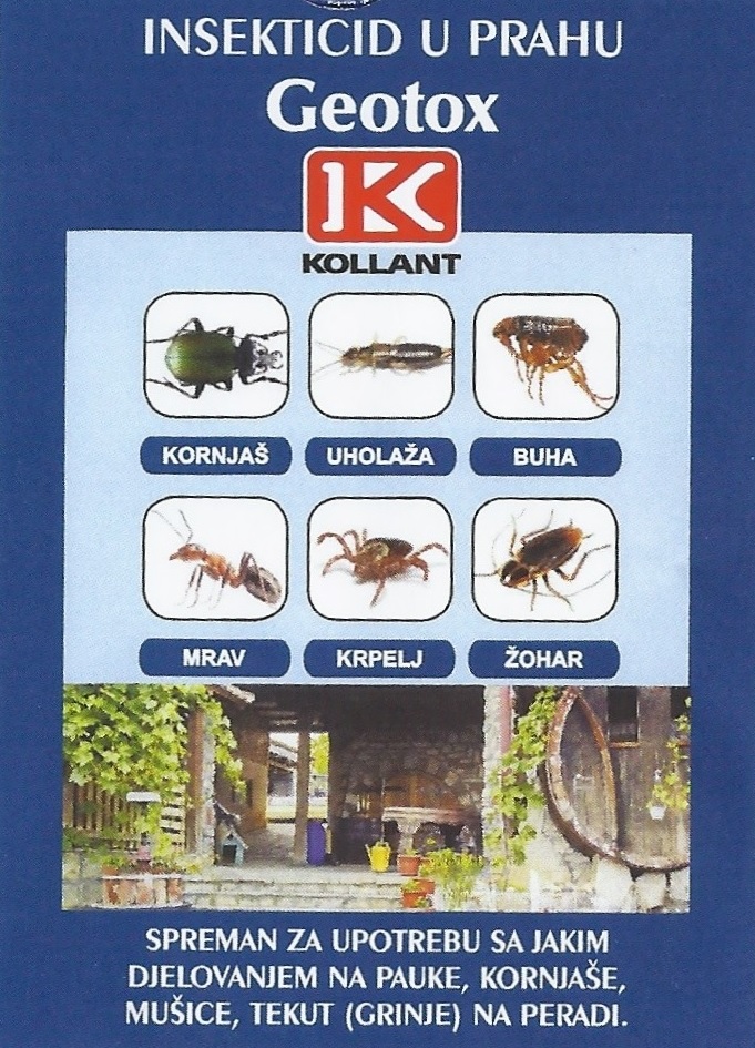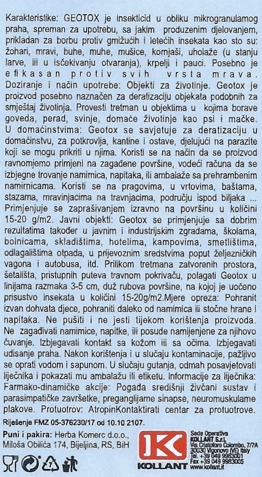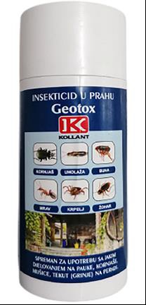 GEOTOX je insekticid u obliku mikrogranularnog praha, spreman za upotrebu, sa jakim produženim djelovanjem, prikladan za borbu protiv gmižućih i letećih insekata kao što su: žohari, mravi, buhe, muhe, mušice, komjaši, uholaže (u stanju larve, ili u išćekivanju otvaranja), krpelji i pauci. Posebno je efikasan protiv svih vrsta mrava.